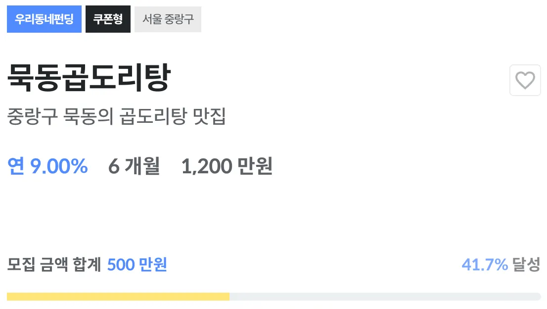 우리동네펀딩은 모집금액이 100% 다 채워지면 펀딩이 종료돼요. 그래서 관심 있는 펀딩이 있다면 빨리 투자하는 게 좋아요. 또 이자가 펀딩이 모집 완료된 후부터 계산되기 때문에, 빠르게 수익을 얻고 싶다면 모집율이 높은 곳에 투자하시는 게 좋아요.