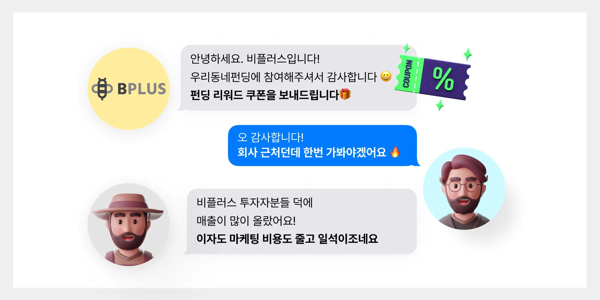 7년차 온라인투자연계금융 전문기업인 비플러스가 펀딩 페이지 제작부터 리워드 구성, 홍보, 현물쿠폰 관리까지 모두 지원합니다. 사장님은 신청만 하시면 됩니다!